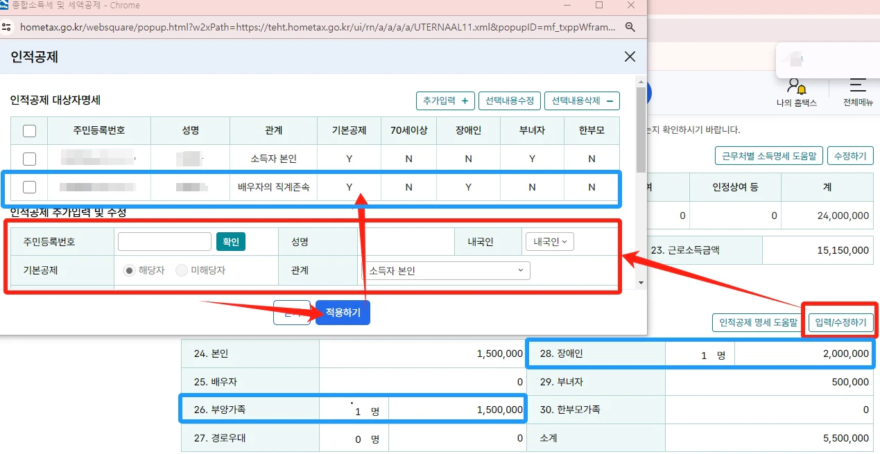 - [인적공제 추가 입력 및 수정]의 아래 칸에 추가하려는 인적공제 대상의 주민등록번호부터 관련 정보 입력 후 적용하기 클릭