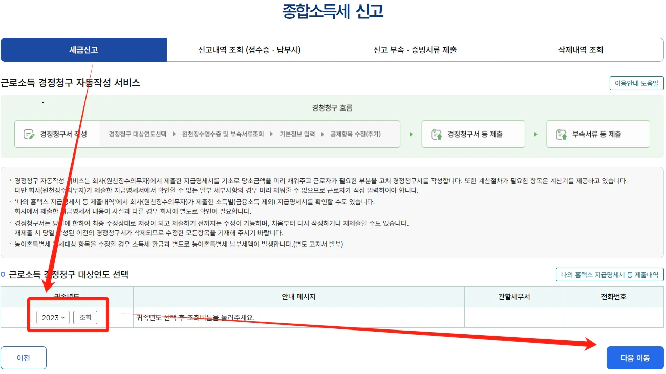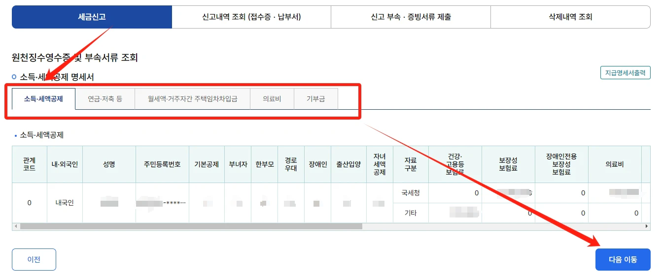 5. 이어 귀속 연도에 해당하는 세금신고분(소득/세액공제분, 연금/저축분, 월세액/거주자 간 주택임차차입금, 의료비, 기부금 등)의 자료를 순차적으로 열람 및 확인합니다. 확인 후, 아래의 파란색 버튼, 다음 이동을 누릅니다.