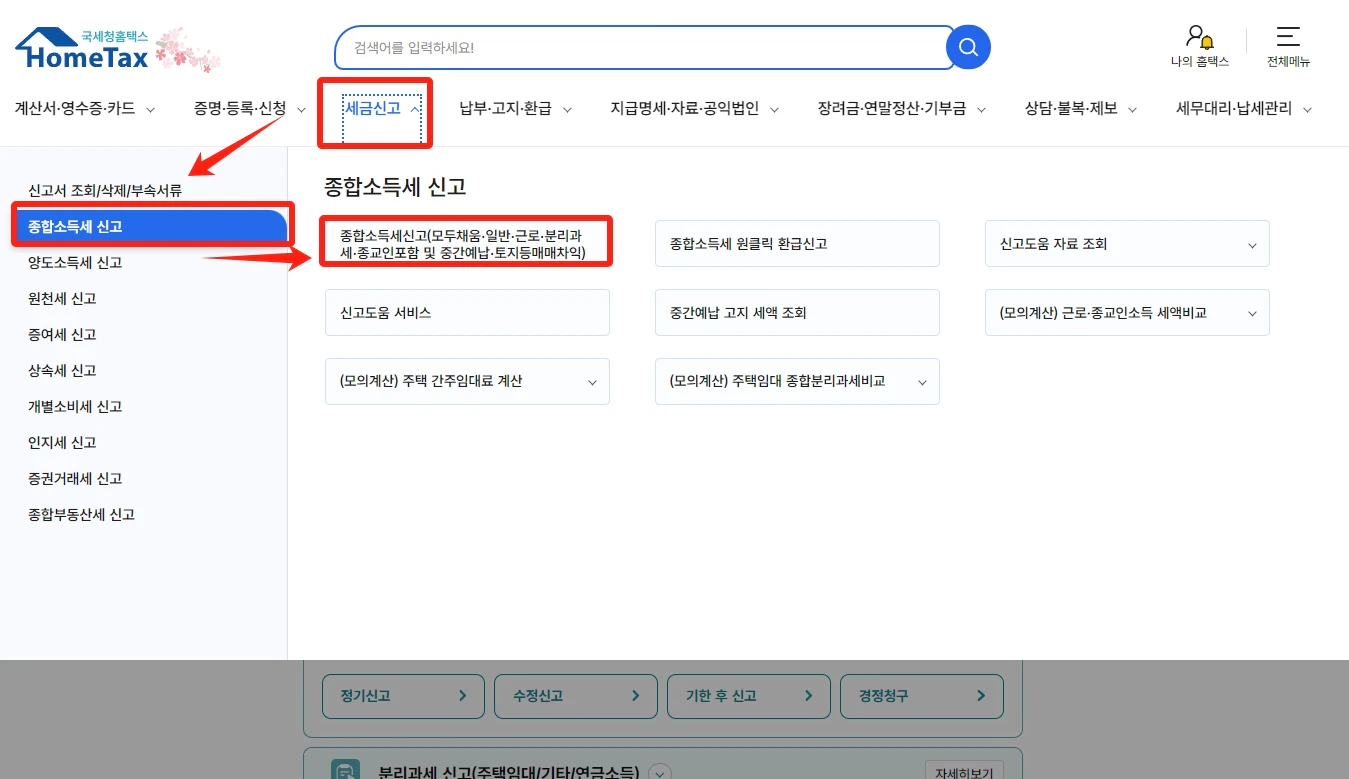 2. 아래 화면(↓)과 같이, 세금 신고 > 종합소득세 신고 > 종합소득세신고(모두채움, 일반, 근로, 분리과세, 종교인포함 및 중간예납, 토지등매매차익) 메뉴에 접속합니다.