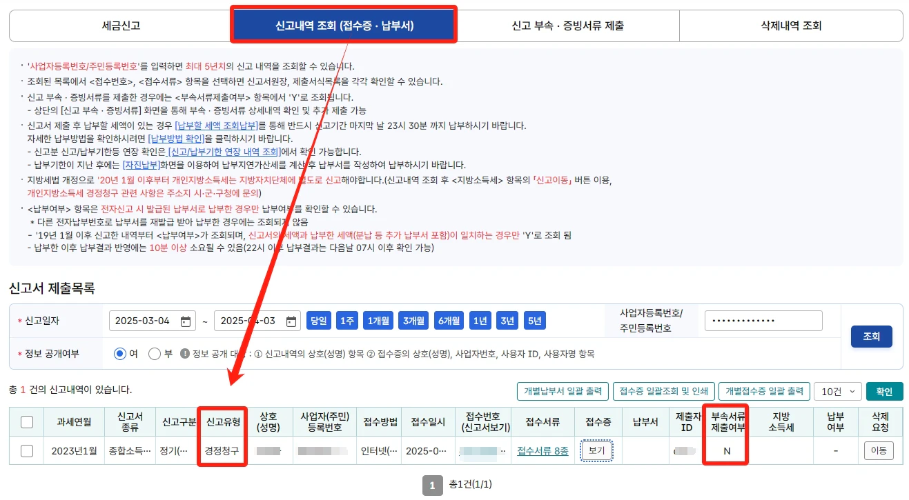 7. 최종 제출 후에는 아래 화면(↓)이, 신고내역 조회 페이지가 뜹니다. 제 경우는, 부속서류 제출여부 N이 표기되어 추가 서류 제출이 필요 없음으로 나왔어요. 하지만 경정청구 사유에 따라서 부속서류를 제출해야 하는 경우가 있어요. 예컨대, 주택차입금을 납입한 증빙 자료가 요구되는 경우, 관련 서류를 발급받아 온라인에서 제출을 해야 합니다.